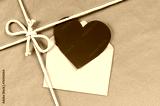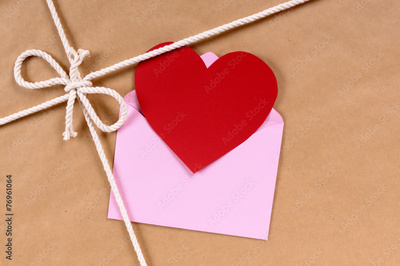 Brown paper package parcel background with red valentine heart shape card gift tag or love message photo