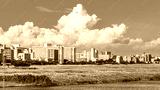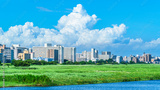 夏の多摩川 青空広がる川沿いの住宅街【東京都-神奈川県】 Tama River in summer. A residential area along the river with a blue sky - Tokyo, Kanagawa, Japan