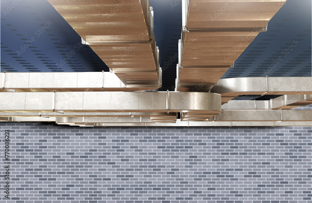 Overhead Industrial Air Ducts and Ventilation Shafts Against Blue Ceiling 3d image