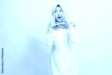 young Asian Muslim woman standing to the candid camera with both hands near her mouth shouting making an announcement. Fashion, pointer, business and promotion concept