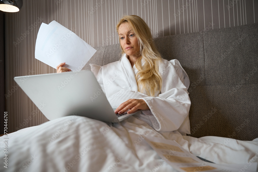Female entrepreneur working on her portable computer in hotel room