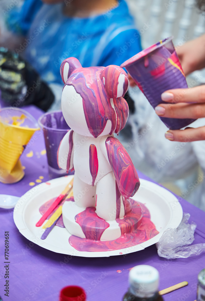We water the plaster figurine of the bear with paints of various colors. Creativity for children.