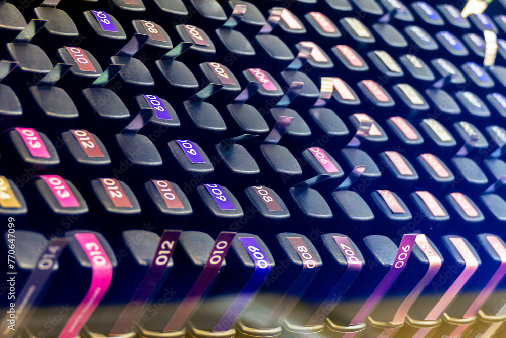 A large display case with many jars of nail polish of different colors, arranged in rows. The jars are arranged in such a way as to highlight their color and type. T