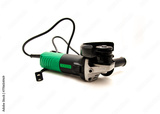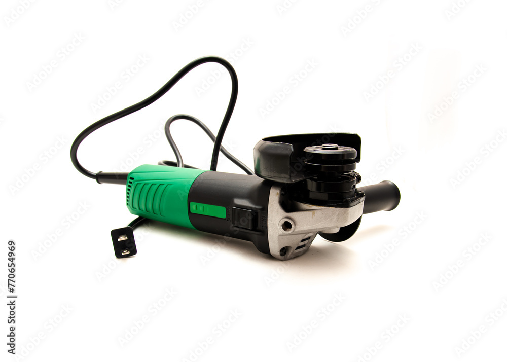 Universal motor with carbon brushes rotor in adjustable guard protection of new corded angle grinder, no attached griding disc isolated on white background, cut grind tool for metal, stone