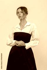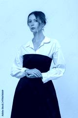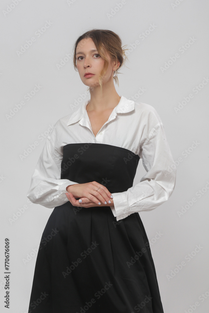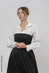 Serie of studio photos of female model wearing white button-down shirt under black tube top A line midi dress