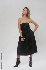 Serie of studio photos of female model in black tube top A line midi dress