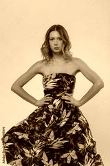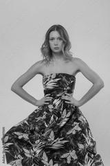 Serie of studio photos of female model in strapless tube top A line midi dress with flared skirt in tropical black floral pattern