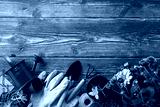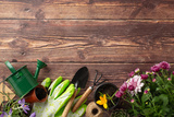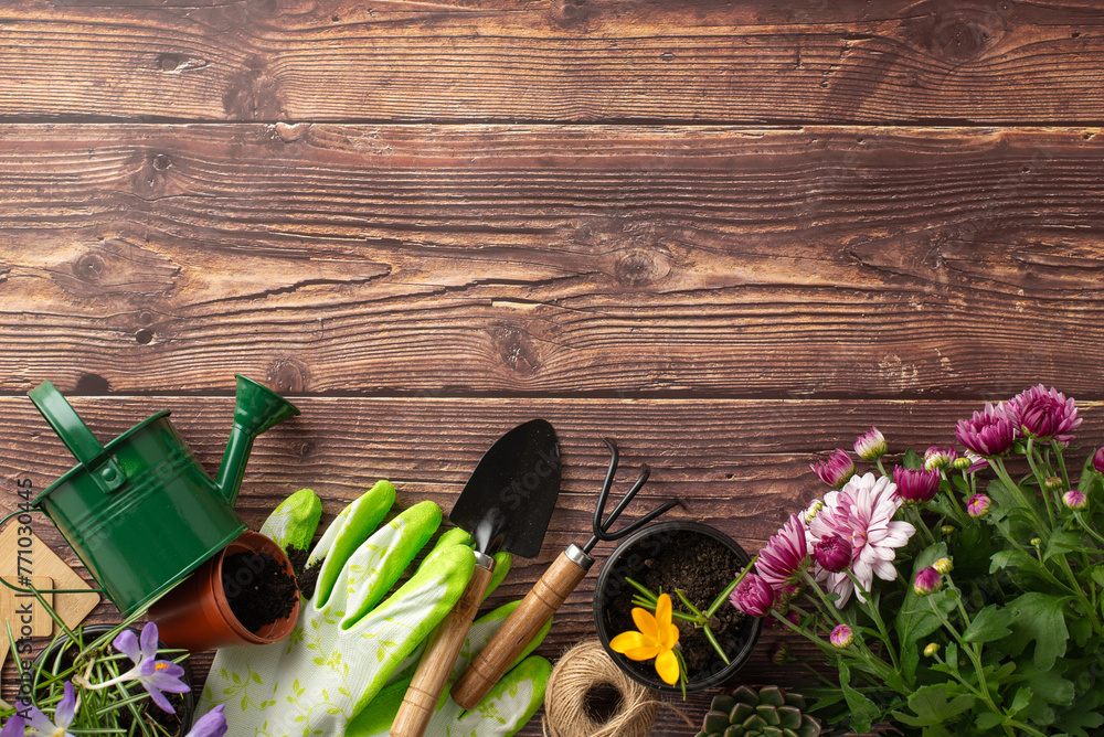 Embrace spring vibes with garden work essentials. Top view of vibrant seedlings, watering can, spade, gloves, and more on rustic wood backdrop. Ideal for gardening enthusiasts