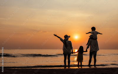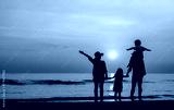 silhouette, together, family, sunset, sunrise, friendship, parent, playing, sunlight, happiness. family is standing on the beach, with the sun setting in sky. children are holding hands with parents.