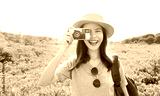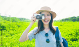 Woman tourist holding digital camera with taking photo on garden park.
