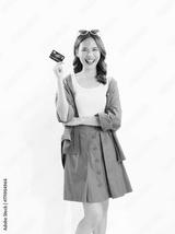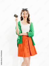 Cheerful beautiful Asian women wear an green shirt with holding credit card isolated on white background.