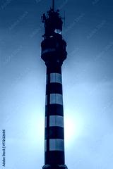 Lighthouse against the backdrop of sunset. Scarlet crimson sunset