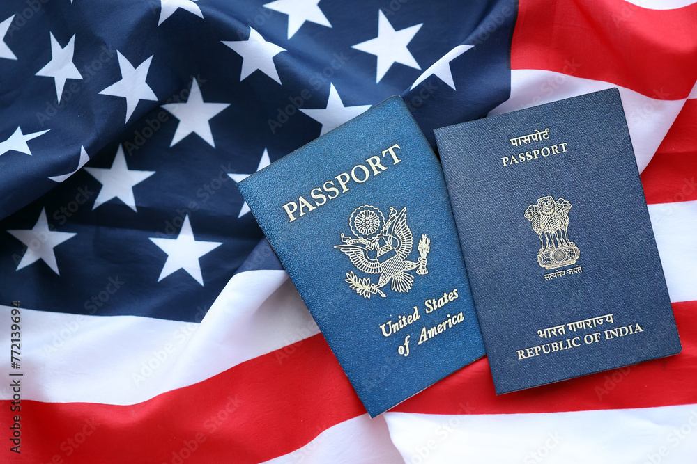 Passport of India with US Passport on United States of America folded flag close up