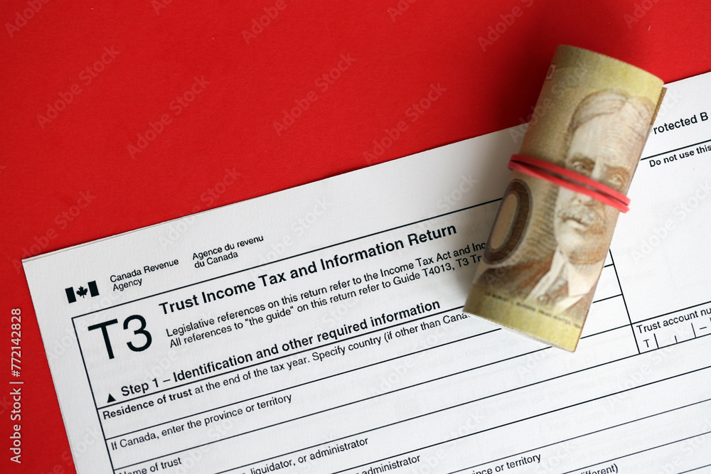 Canadian T3 tax form Trust income tax and information return lies on table with canadian money bills close up. Taxation and annual accountant paperwork in Canada