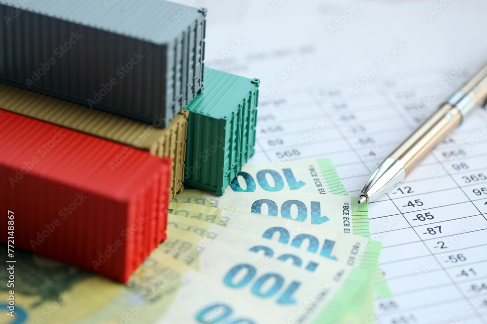 Global business container cargo ship in import export business logistic. Company shipping and logistics in European Union with euro money bills and pen close up