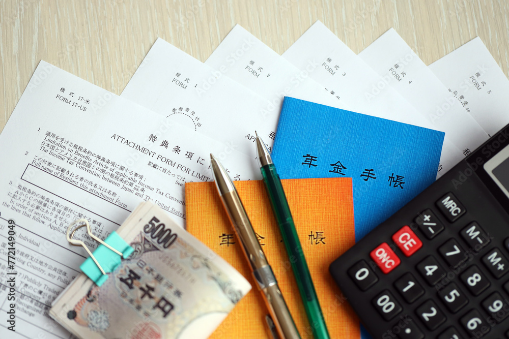 Japanese pension insurance booklets on table with yen money bills, pen and calculator on table close up