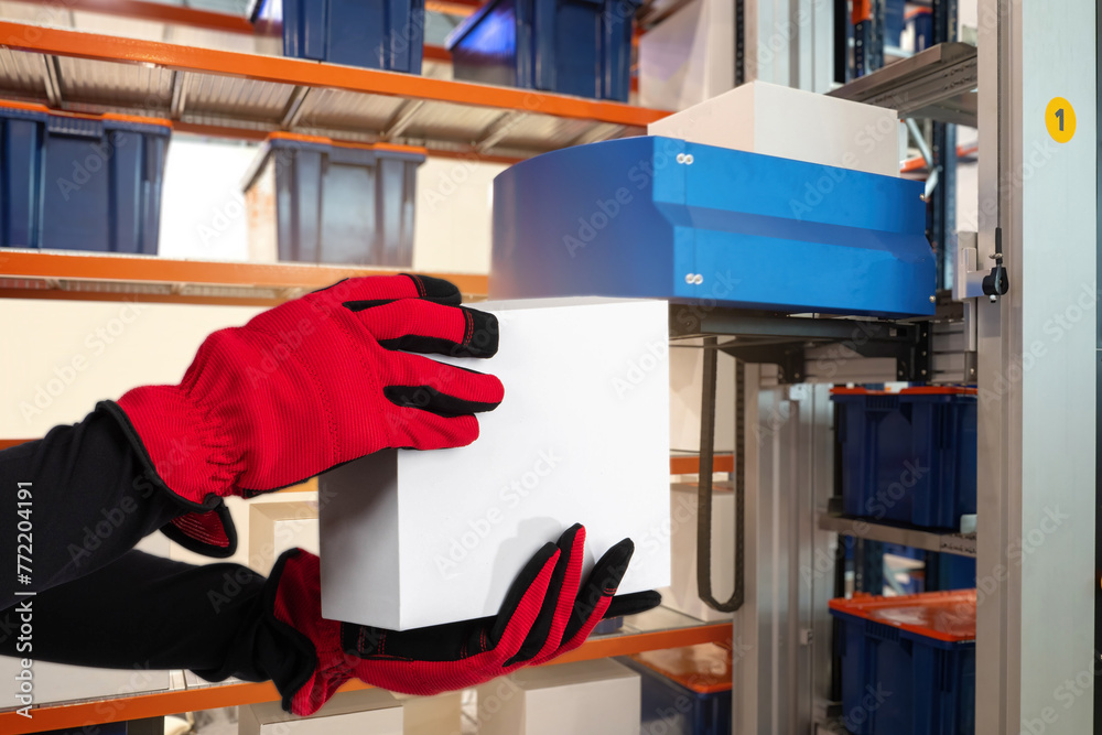 Box in hands storekeeper. Warehouse fulfillment. Parcel without inscriptions. Concept for fulfillment goods from online store. Hands with box near warehouse equipment. Automated storage equipment