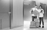 Self storage unit. Couple with boxes near safekeeping room. Self storage unit for storing things. Man and woman prepare boxes for storage. People inside warehouse for personal belongings