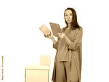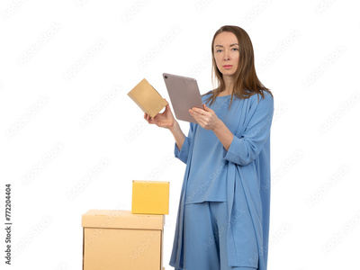 Woman with boxes and tablet computer. Businesswoman engaged in fulfillment process. Woman owner of fulfillment company. Businesswoman in blue clothes. Girl with boxes on white. Serious businesswoman