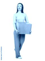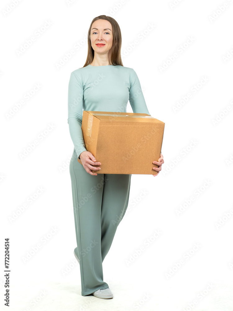 Woman with cardboard box. Girl carries parcel to post office. Lady with box in full length. Woman received delivery from courier. Girl with parcel on white. Concept receiving parcel from online store