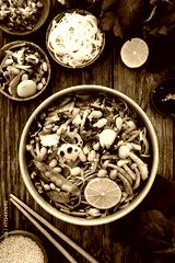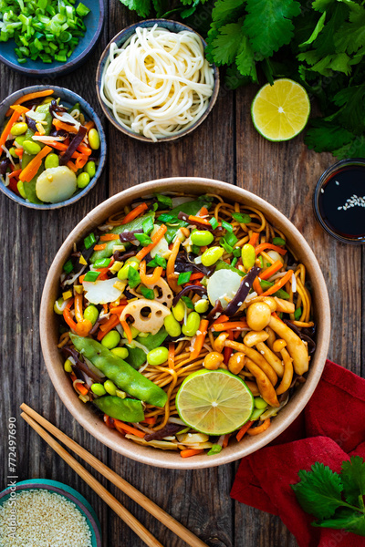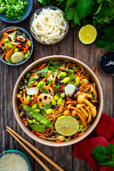 Takeaway food - Asian style stir fried vegetables and noodles on wooden table