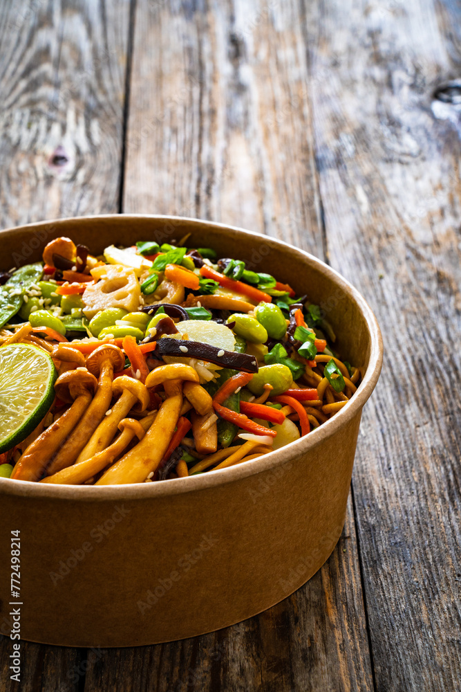 Takeaway food - Asian style stir fried vegetables and noodles on wooden table