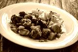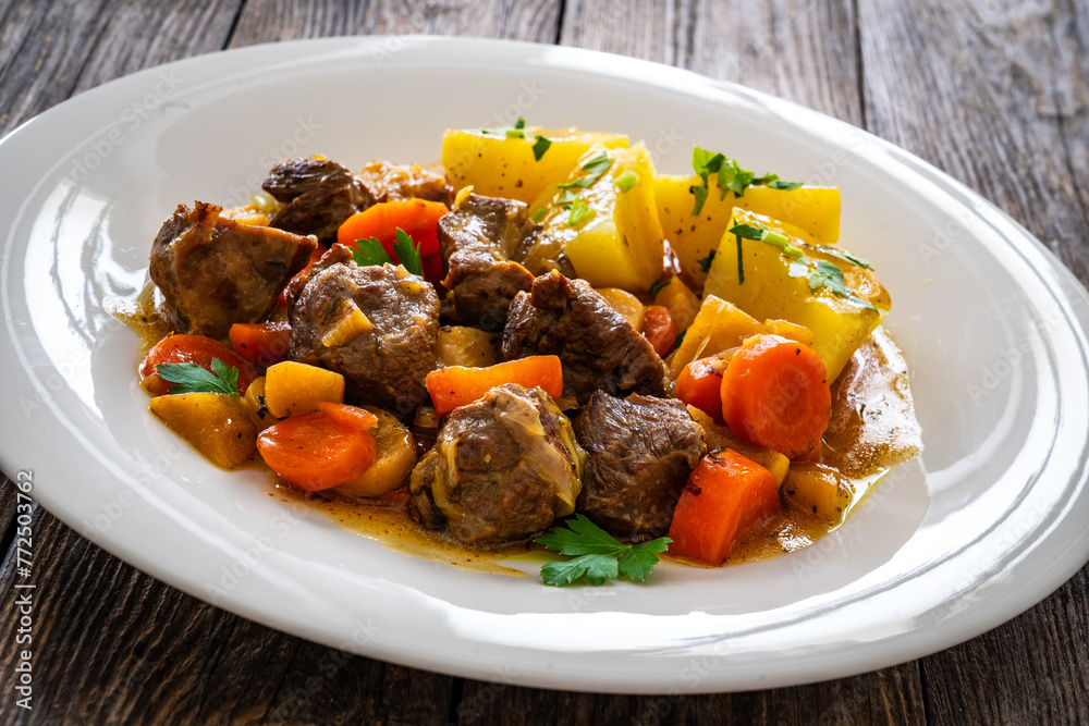 Roast pork cheeks with carrots and celeriac in sauce with boiled potatoes on wooden table
