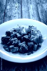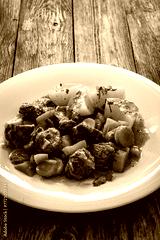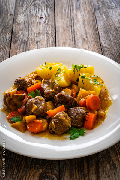 Roast pork cheeks with carrots and celeriac in sauce with boiled potatoes on wooden table