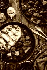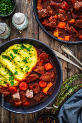 Irish stew for St. Patrick's Day - roast beef in beer with potato puree served on wooden table