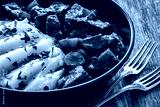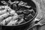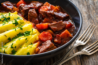 Irish stew for St. Patrick's Day - roast beef in beer with potato puree served on wooden table