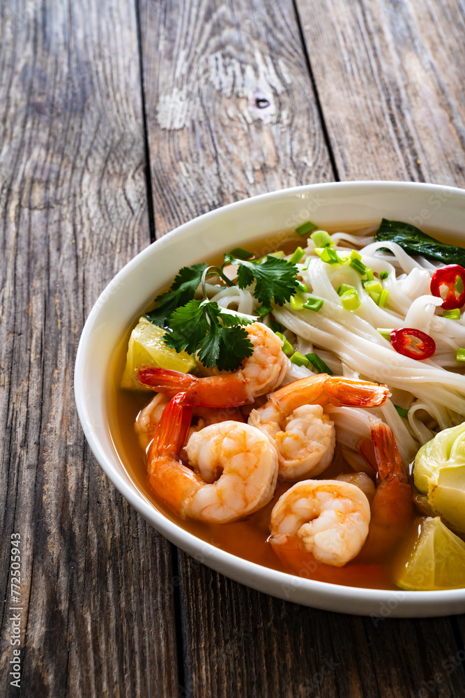Shrimp Pho soup - Vietnamese soup with shrimps on wooden table