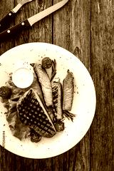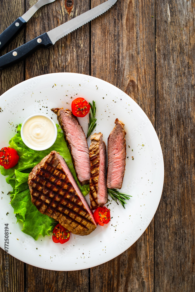 Grilled beef sirloin steak with fresh vegetables on wooden table