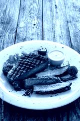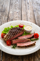 Grilled beef sirloin steak with fresh vegetables on wooden table