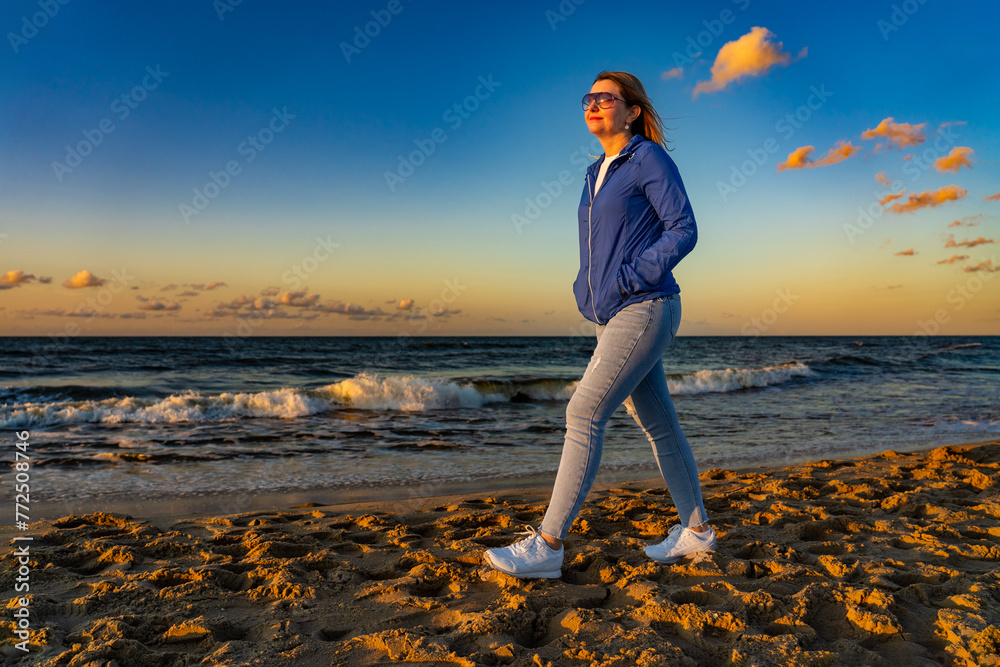 Beautiful mid adult woman walking on beach at sunset