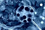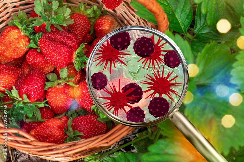 Magnifying lens with simulated germs, viruses, bacteria, food allergy concept. Wicker basket with strawberries.
