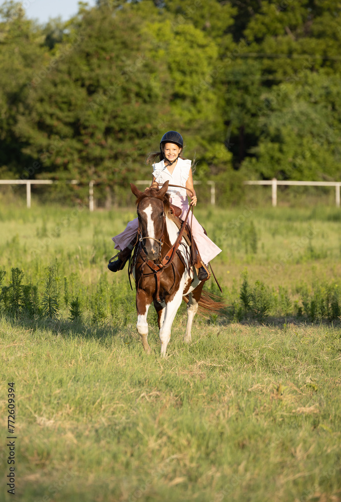 Little Girls with Horses riding western quarter horse and paint horse cowgirls in pink having fun