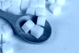 Sugar cubes with a wooden spoon circled on a white backdrop, representing sugar consumption