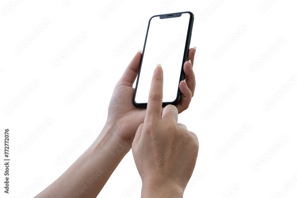 Closeup studio shot, collection of hand holding phone blank touch screen. isolated on white background. Business hand holding a modern smartphone. clipping path