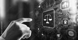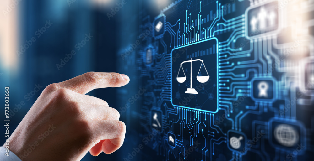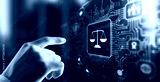 Justice and law concept. Icon Law on virtual screen. Blurred background