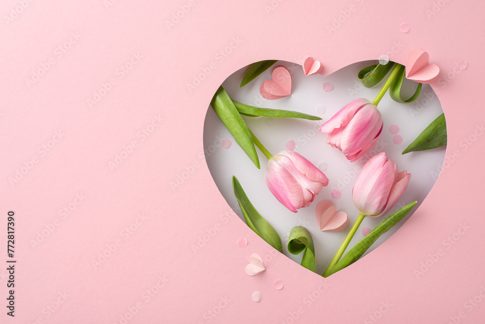 Mother's Day refined concept, seen from top view: fresh tulips, paper hearts, and stylish confetti through a heart-shaped cutout on a pastel pink backdrop, space for text