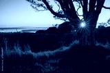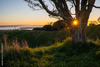 Sunrise over Mt Eden summit with volcanic crater in the foreground. Sun starbursts shining through a huge Pohutukawa tree. Auckland.
