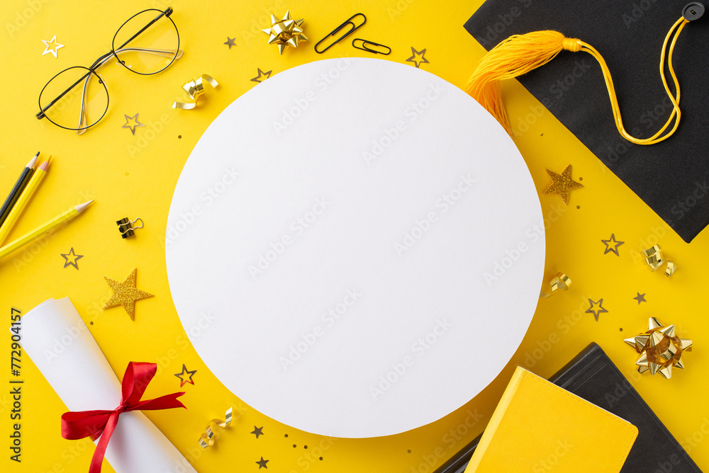 Celebration theme: Overhead shot of graduation cap, diploma tied with ribbon, study materials, books, pencils, specs, vibrant confetti on yellow backdrop, circle perfect for announcements or promotion