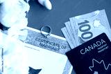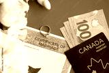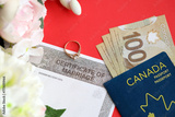 Canadian Certificate of marriage document and wedding ring with canadian dollars and passport close up