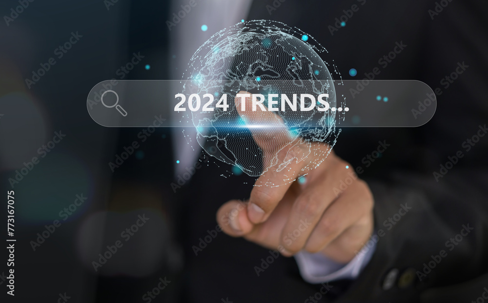Businessman searching keyword of 2024 trends planning in new year, business trends, fashion trends, start up, marketing, planning, technology update, year 2024, SEO, digital marketing online