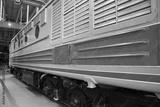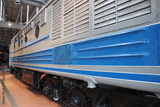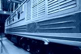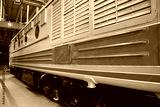 Vintage locomotive retro train. Beautiful locomotive in blue and red colors.