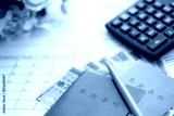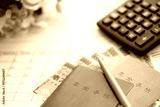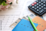 Japanese pension insurance booklets on table with yen money bills and calculator on table close up