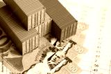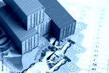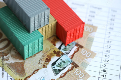 Global business container cargo ship in import export business logistic. Company shipping and logistics in Canada with dollar money bills and pen close up