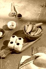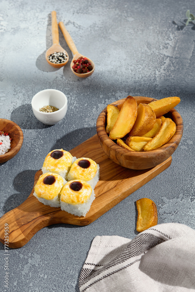 Baked sushi roll set with creamy topping alongside golden potato wedges, a fusion of flavors presented on a wooden board