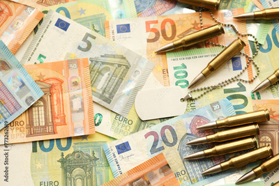 Yellow cartridges and shell casings on euro banknotes. Lot of bills of European union currency and ammo close up