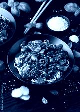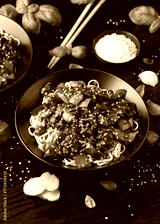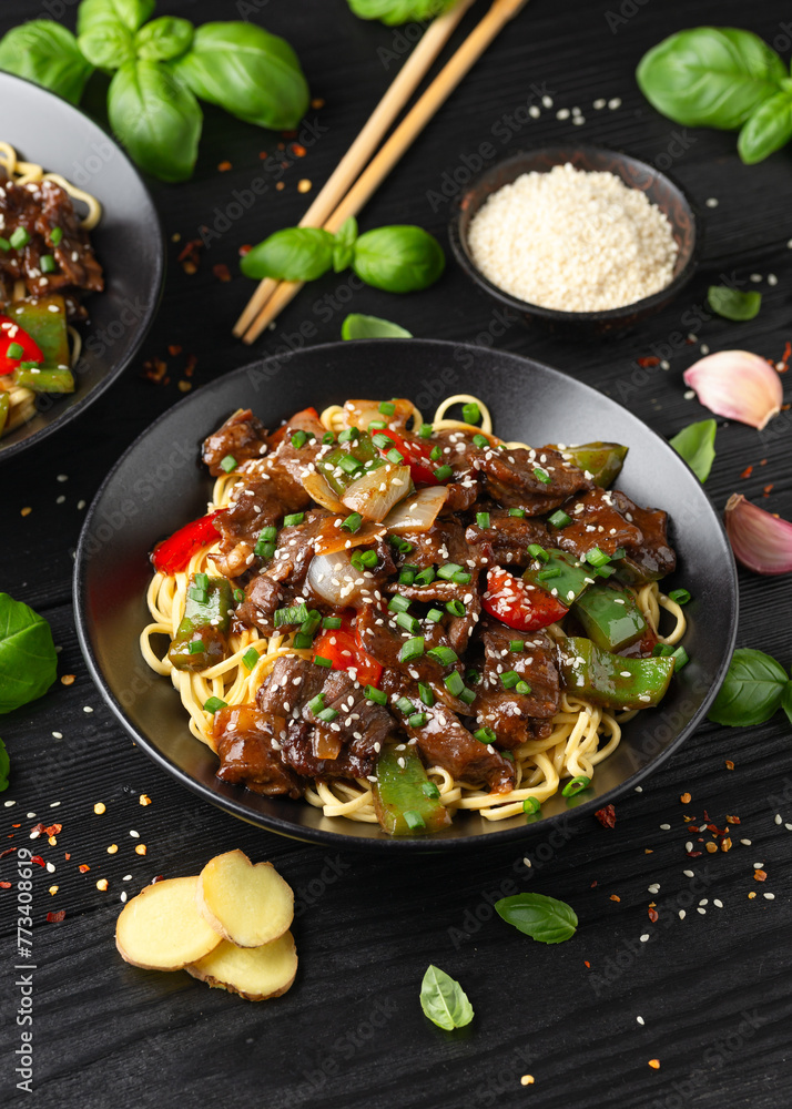 Stir fried beef in black bean sauce with vegetables and noodles. Take away food